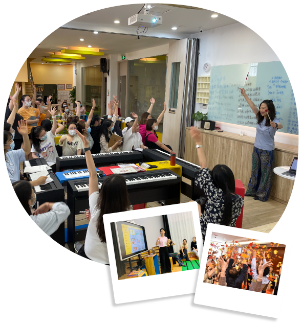 由音乐故事绘本引导孩子进入主题情境:节庆,季节等等。透过音乐、歌曲、念谣,启发孩子的认知、语言能力。并透过体态律动的发展训练孩子的大小肌肉,及全身感觉的统合能力。