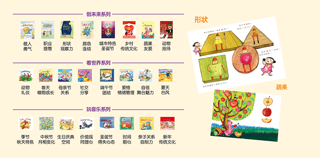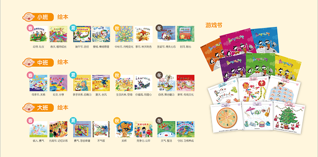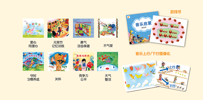 具备律动、道具、乐器等课程活动。含有节庆、季节、颜色、形状等主题的音乐绘本,用故事引导进入歌曲念谣音乐等世界名曲!
